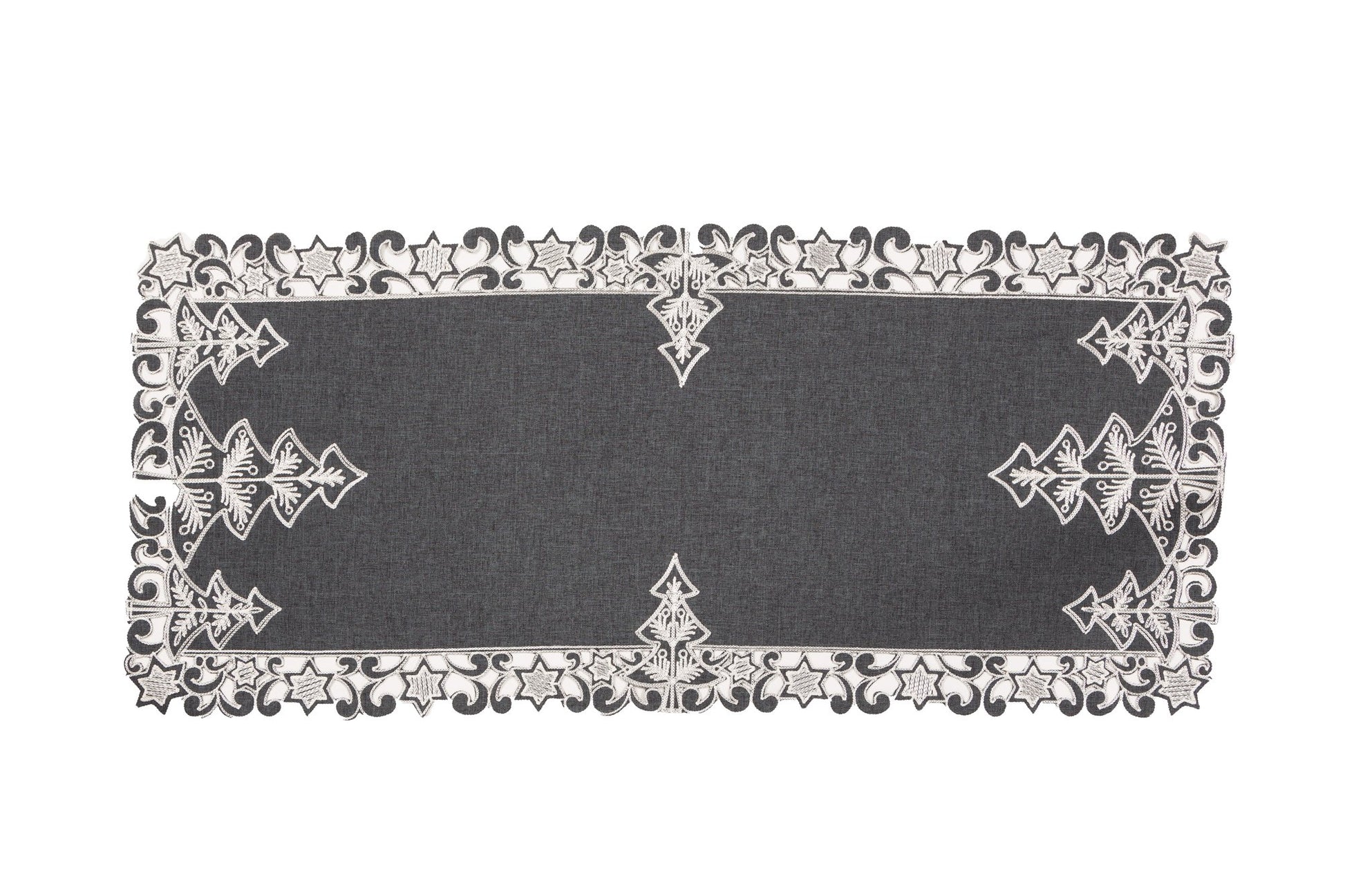 Hand rendered cutwork and embroidered Christmas trees on gray fabric, Clean, crisp and magical, this holiday linens collection features lovely hand rendered cutwork and embroidered Christmas trees. This collection will make it a holiday season to remember.Christmas dinner will be perfectly accented with these warm and inviting holiday linens!